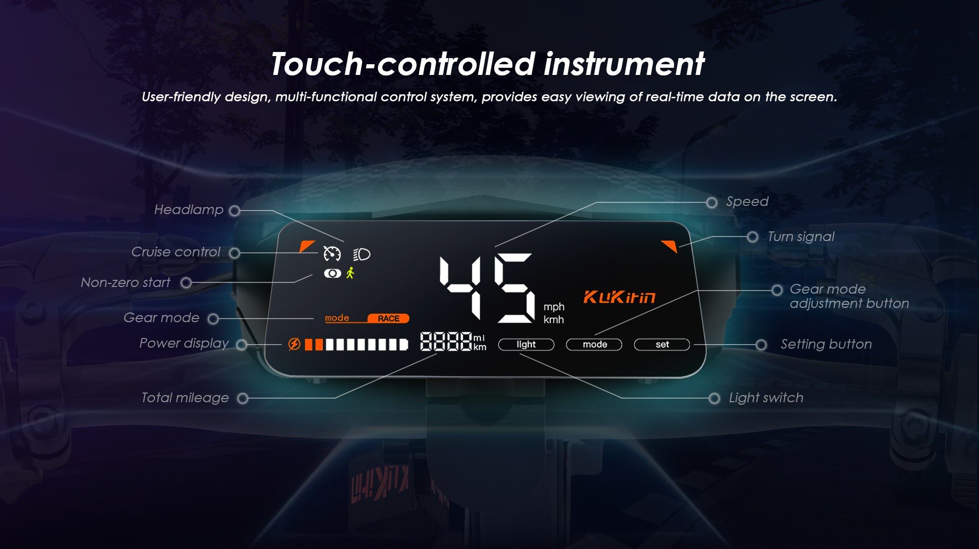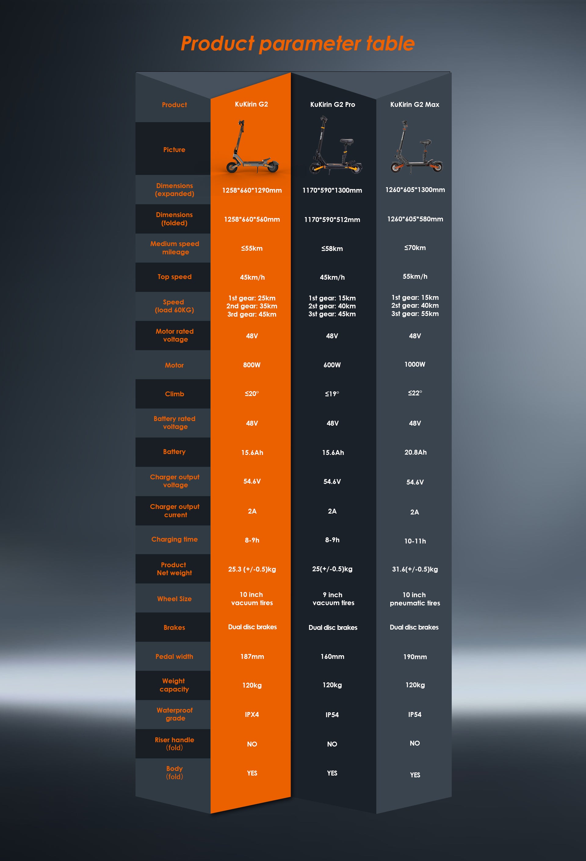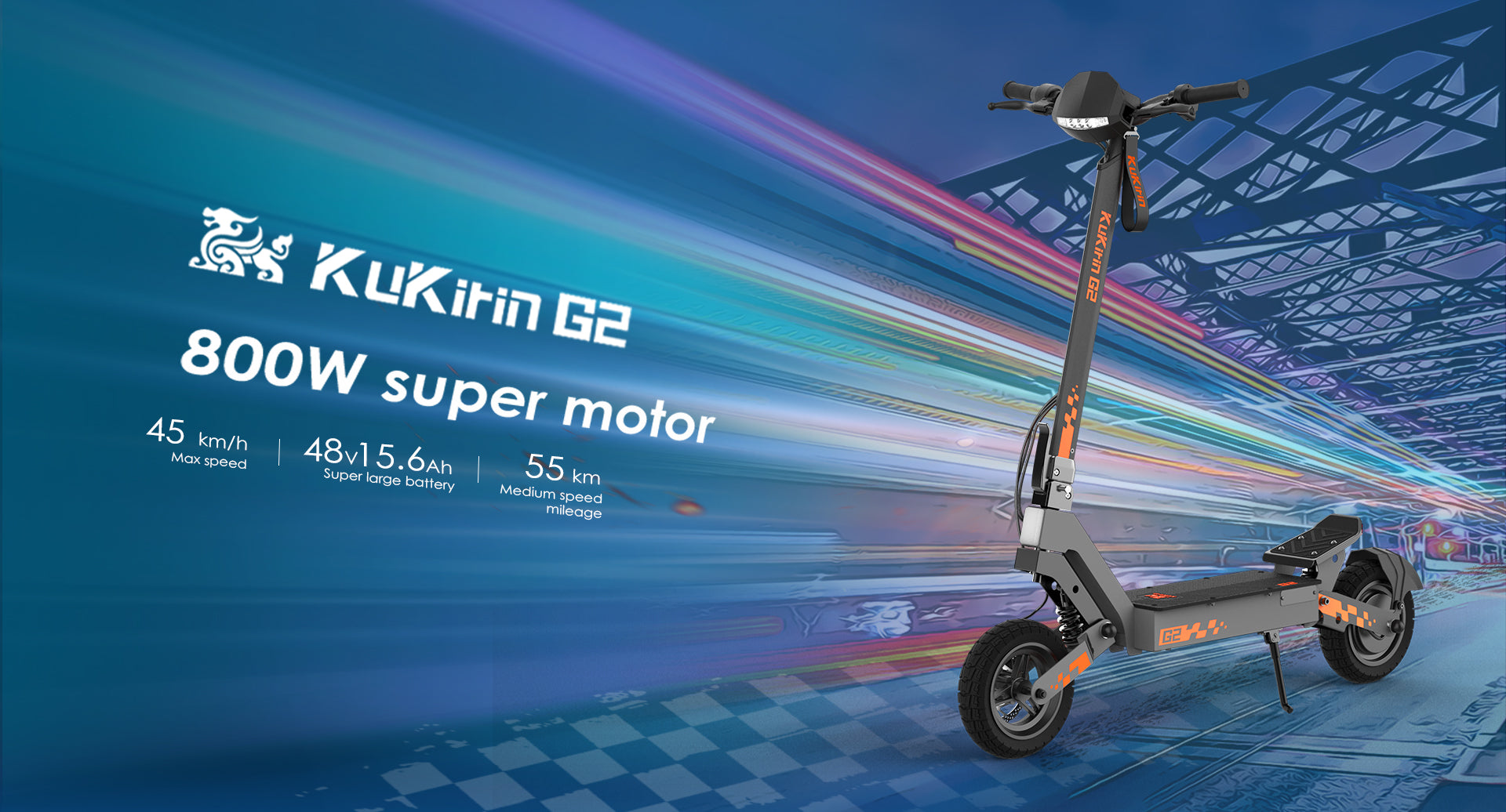 The KuKirin G2 delivers smooth, powerful rides with its 800W motor and three speed modes up to 45 km/h. Its 10" off-road tires and dual suspension ensure comfort on varied terrain. A 48V 15Ah battery offers up to 55 km range. With a touch display and one-touch folding, this 26 kg scooter is portable, intuitive, and ideal for commuting or leisure.