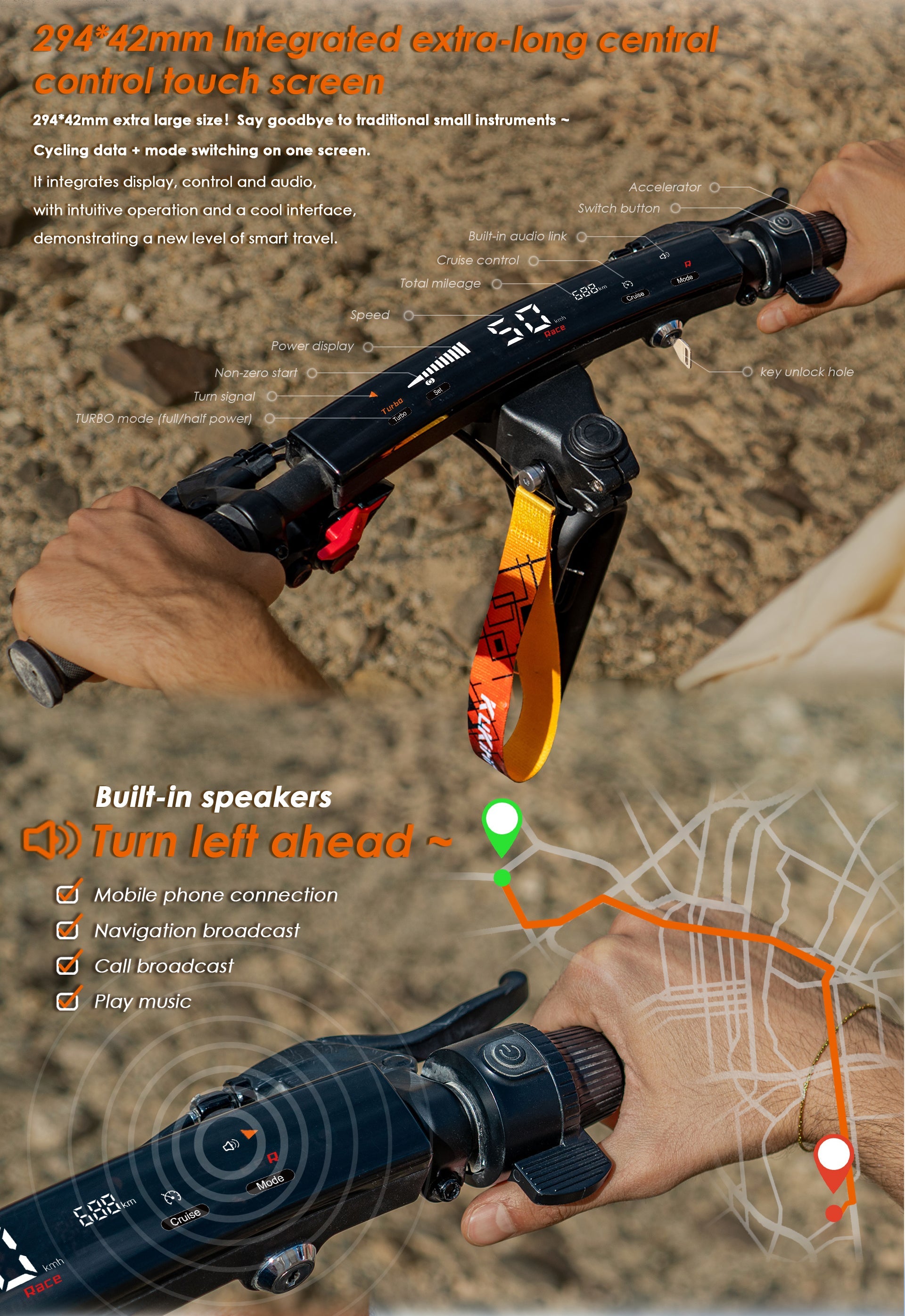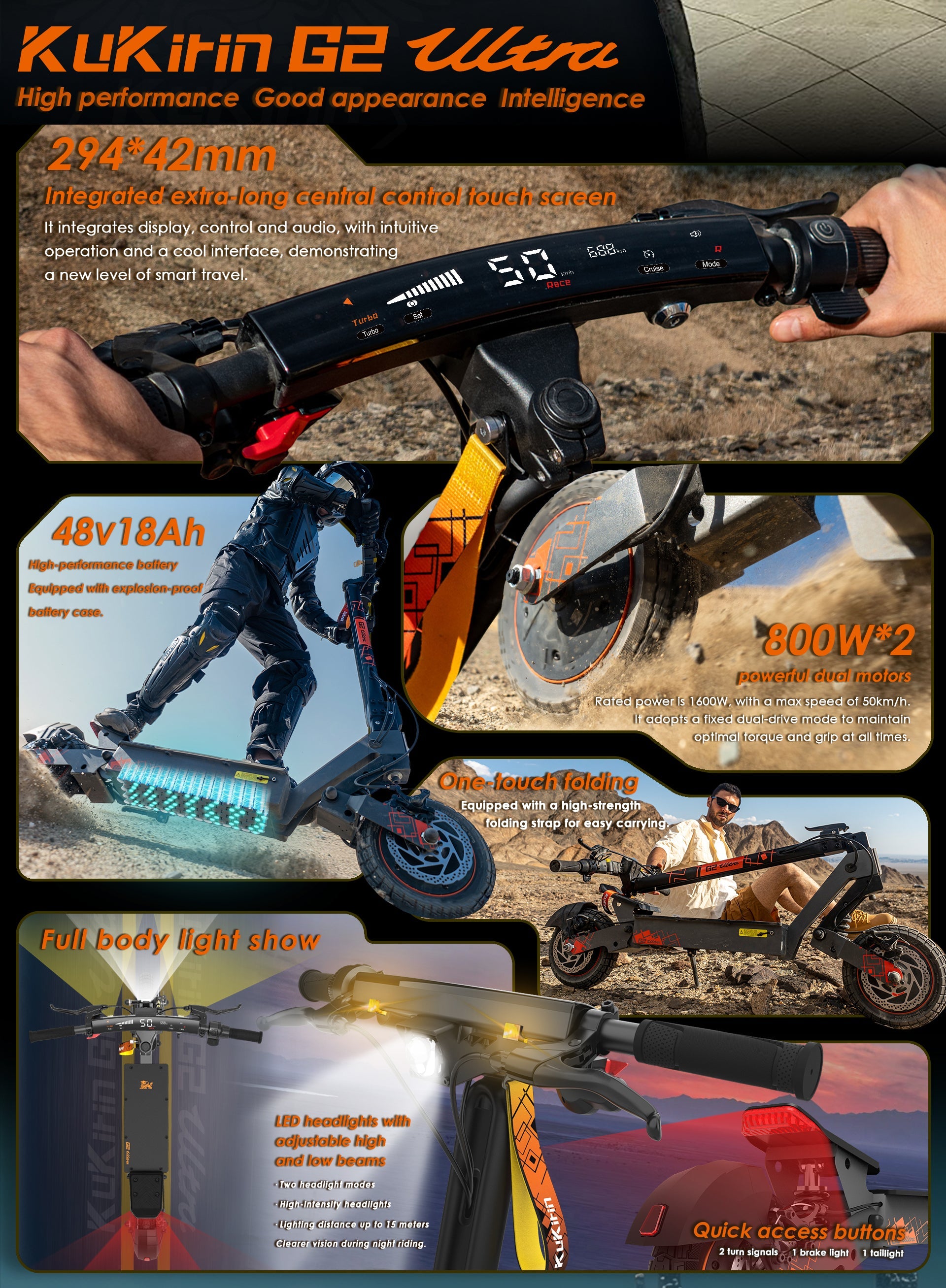 Kukirin G2 Ultra Dual-Motor Electric Scooter: Dual 800W motors can handle 26° slopes, and the 48V 18AH battery provides a range of up to 55km. An industry-first integrated touchscreen lets you easily control your ride. Equipped with 10-inch puncture-resistant tires, dual suspension, disc brakes, and full LED lighting, the G2 Ultra provides a safe, smooth, and exciting ride on any terrain.